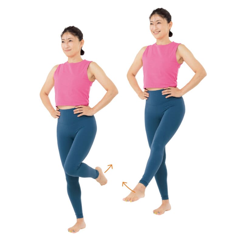 2. 手を下ろし、脚を持ち上げます。片足立ちで体幹や膝まわりの強化に。
