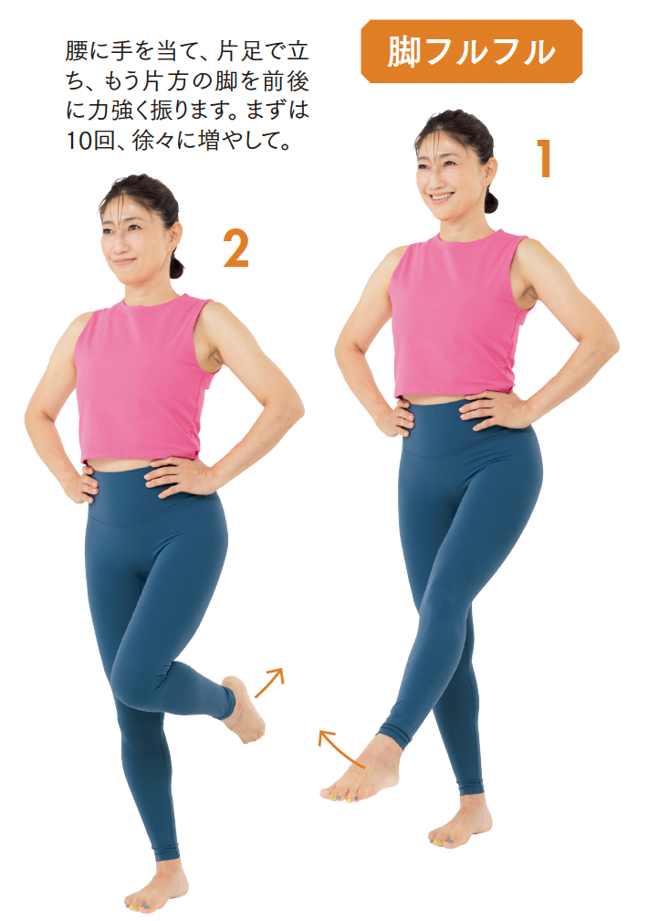 腰に手を当て、片足で立ち、もう片方の脚を前後に力強く振ります。