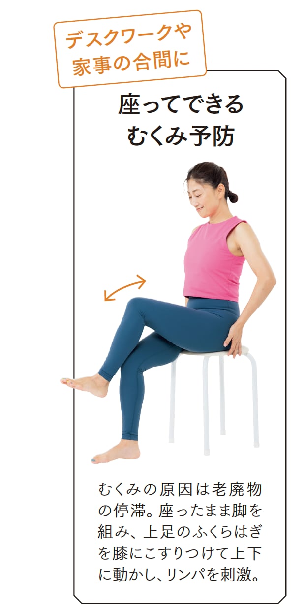 座ったまま脚を組み、上足のふくらはぎを膝にこすりつけて上下に動かし、リンパを刺激。