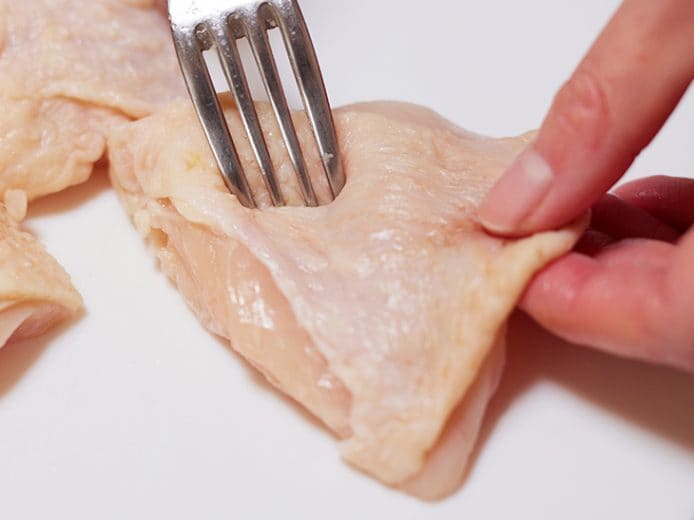 2.牛乳にお肉を漬ける:鶏肉の臭みがとれて柔らかくなる。