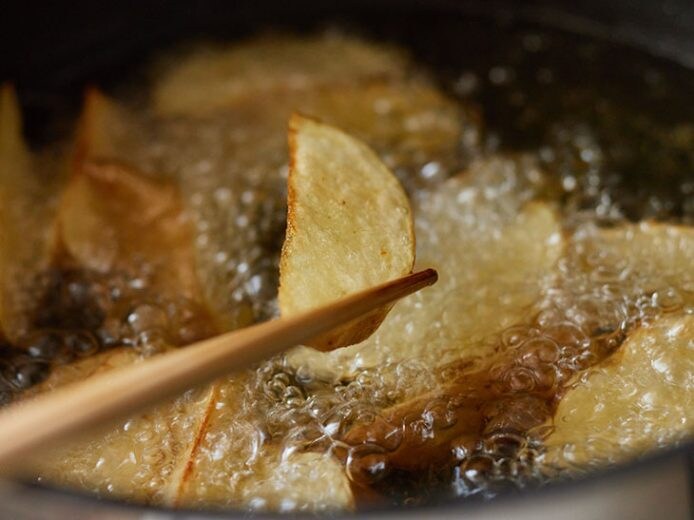 3.レンチ後のじゃがいもは切った後に粗熱をとる:水分が飛んでカリッと揚がる。