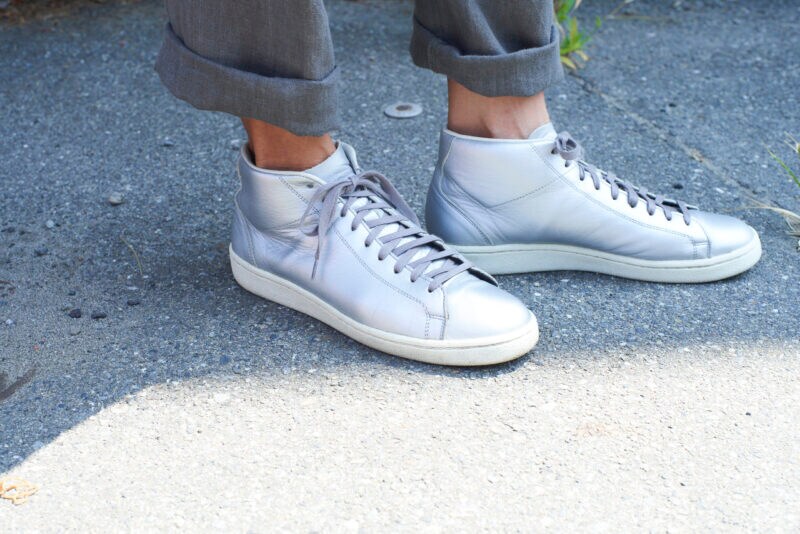 山根さんが愛用するパトリックのスニーカー。「このシルバーのスニーカーは防水加工を施してあるので、旅先での急な雨にも、足場の悪い山道を歩くのにも便利です」(山根さん)。パンツのすそを折って、素足を少し見せると、こなれた雰囲気に。