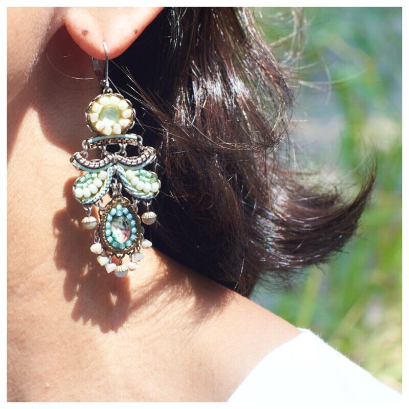 シンプルなトップスには、目を惹く華やかなピアスを。「旅先ではアクセサリーで着こなしに変化をつけます。淡いターコイズカラー系のピアスは、大ぶりで肌なじみが良くてお気に入りです」と山根さん。肩までの長さのヘアスタイルにぴったり。