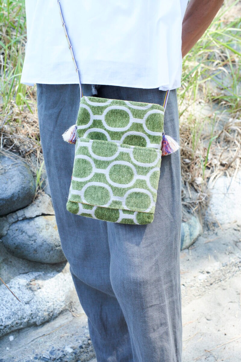 ポシェットは両面で柄違い。「ヨーロッパのテキスタイルを片面に、もう片面にはアンティークの帯を解いた『鳳凰(ほうおう)』の柄を。ポシェット1つで二通りが楽しめます」と山根さん。コーデに合わせて、アクセサリー感覚で使うことも。