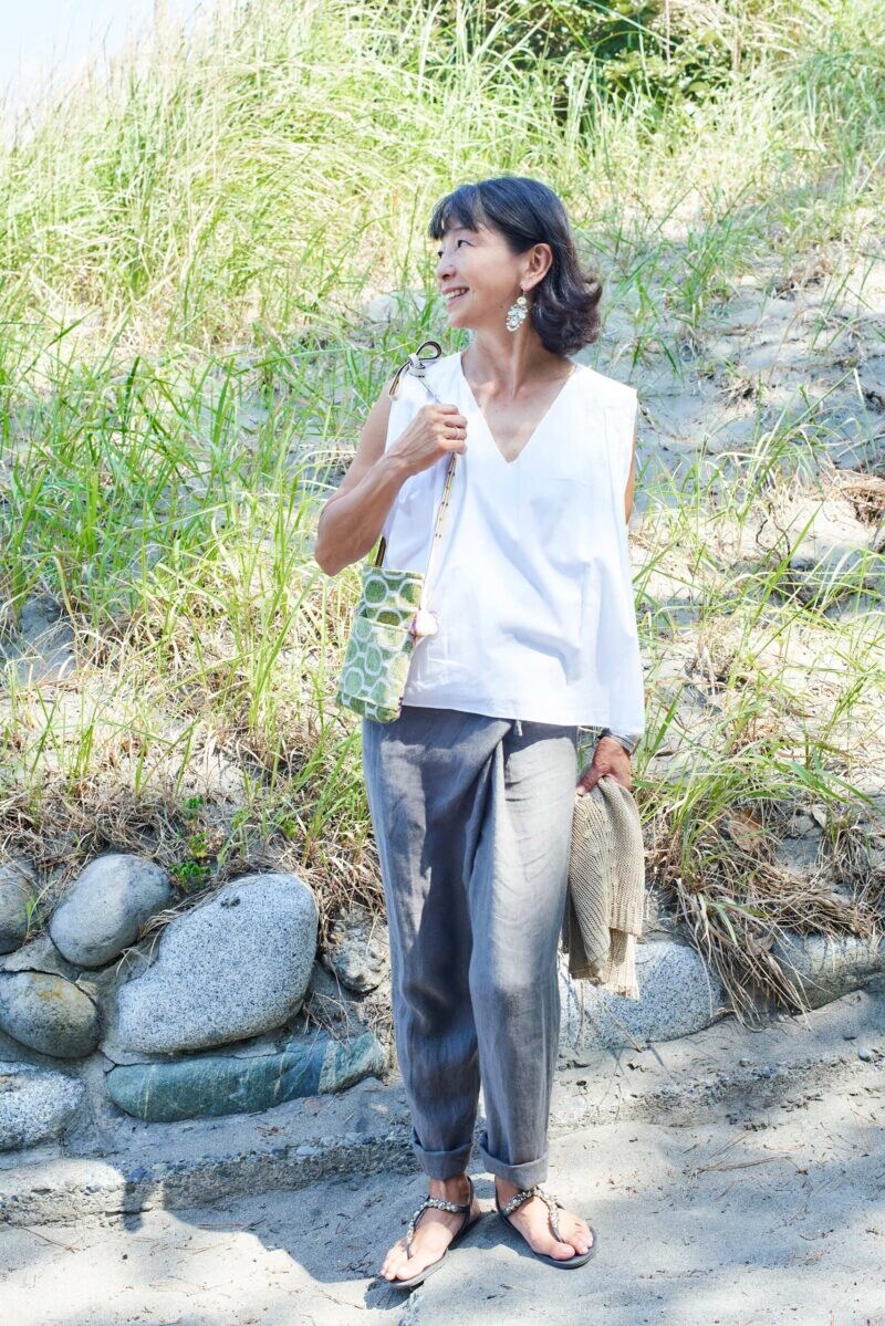 おしゃれ賢者のリアルな着こなしとワードローブを拝見する「1週間コーデ」。今週は葉山御用邸(神奈川県)の横、一色海岸近くにあるサロン「やまねこ」を主宰する山根佐枝さん(58歳/身長159.8cm)。フリーエディターの仕事で一泊取材に出かけるときは、リネンのカシュクールパンツを着まわします。トップスやアクセサリーをチェンジするだけで印象が変わる‟着まわしテク“をご紹介します。