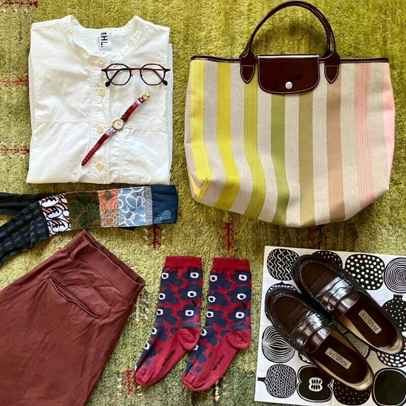 マリメッコの靴下、メガネ、腕時計も同じくボルドーで統一。