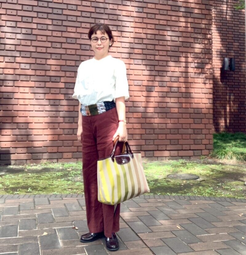 パンツは無印良品。ボルドーに近いブラウンで深みのある秋色ながら麻混素材が着心地よく、この時期重宝しています。