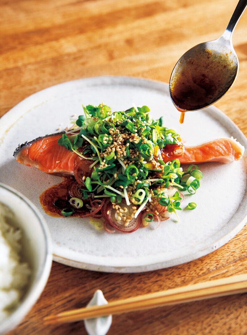 鮭はあえて焼かず煮ることでふっくら仕上げて