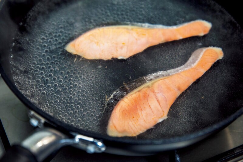 沸騰した湯に鮭を入れたら弱火にして加熱することで、身がやわらかくふっくらとした仕上がりに。