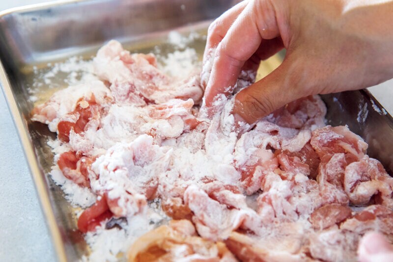 肉の表面をコーティングし、水分や旨みを逃さず、加熱後にたれを絡みやすくする片栗粉。