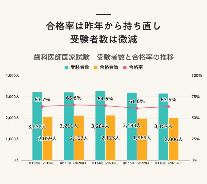 歯科医師国家試験の合格率はおおむね64〜65%で推移してきましたが、前回の第115回の合格率は61%に低下、合格者数も2,000人を下回りました。