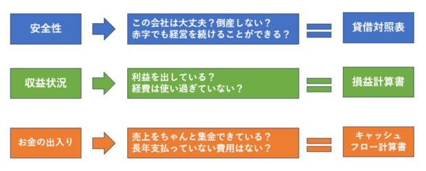 このような目的で企業は決算を行っていますが、決算書は主に以下の3種類で構成されています。