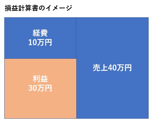 左側に決算期間にかかった費用や仕入などの経費を集計し、右側に売上を計上します。図のように経費よりも売上が多ければその差額を利益として認識することができます。損益計算書は文字通り「損をしているか、利益が出ているか」確認できるシンプルな考え方のものです。