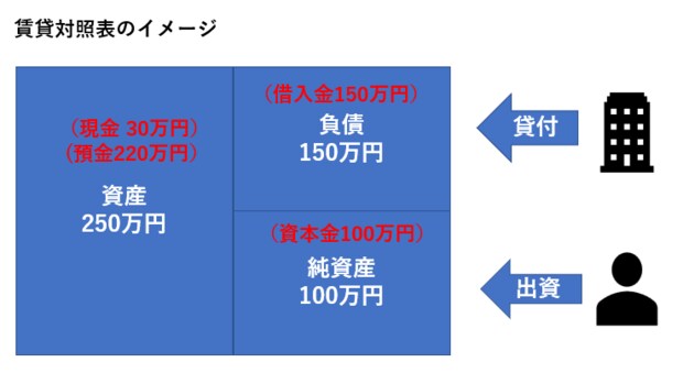 株主が出資してくれたお金と銀行が貸してくれたお金、上の例では250万円です。会社スタート当初、この250万円が資産となり、今は現金で30万円、残り220万円は預金にしているということが貸借対照表から分かります。