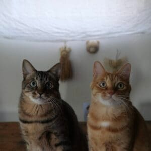 やあ、おまたせ。ぼくらはウメタ(左)とキンタ(右)! おなじ日に生まれた9さいの兄弟さ。さむい北国で、ふたりのお世話係と仲よく暮らしているよ。彼らはいつもカリカリじゃないものを食べているからさー、つい気になってスンスンしちゃうんだ。その甲斐あってか、雪にも負けない立派なボディに成長中! 食いしんボーイズはこうして誕生したってわけ。本誌2026年1月号の&NEKO「ゆるねこ探訪記」では、わたなべとしふみさんによるウメタとキンタの紹介イラストを掲載しています。