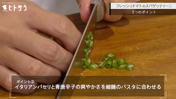 イタリアンパセリと青唐辛子の爽やかさを細麺のパスタに合わせる