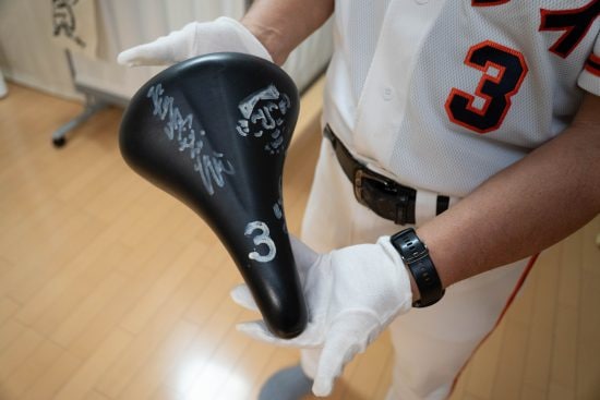 プリティ長嶋:取材なので並べてみましたが、こうして見ると本当にみんな宝物です。宮崎キャンプで長嶋監督が乗り回した自転車のサドル、サインを書いてもらった背番号3のユニフォーム、イベントでご一緒したときの写真……。ここにあるものには全部思い出がありますよ。