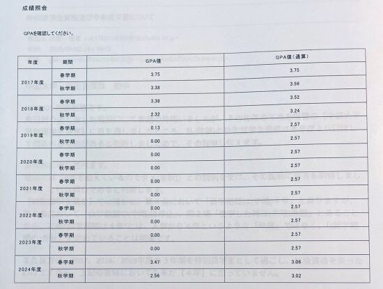 結果、‘19年度末時点の通算GPAは3.00を下回り、特別奨学生資格を喪失。その後’20~’23年にかけて大学を休学し、在籍料のみを支払う状態が続いていた。