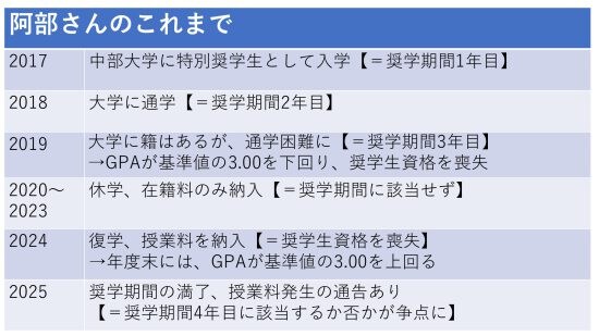 ‘19年度末で奨学生期間3年分は満了しているものの、休学期間を除けば、’24年度は資格取消の翌年に当たります。’25年度は資格が復活し、奨学期間4年目に該当することになる。だとすれば、『大学側の認識がおかしい』と直感しました」(阿部さん)