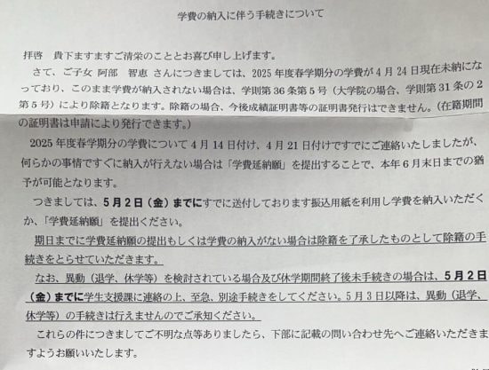 4月2日、改めて「私(阿部)の特別奨学生は本年度(※編集部注:’25年度)より復活して然るべき」と大学にメールを送ったところ、学生支援課の担当者から、’24年度の1年間は資格復活のための猶予期間である「取消期間」に該当すること、学内では「取消期間=奨学期間」として扱われるために’24年度が期間の4年目となり、奨学生期間は満了になるとの説明があった。