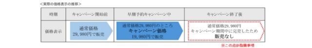 消費者庁は、「ジャパネット通常価格」(29,980円)が、セール期間経過後に適用される将来の販売価格であるかのように表示されていたと指摘。実際には、セール期間経過後に当該将来の販売価格で販売するための合理的かつ確実に実施される販売計画はなかったものとした。