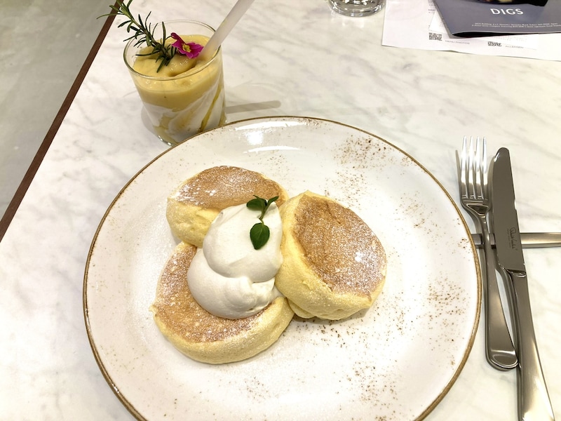 こちらでシグナチュアメニューの「パンケーキ」と「スムージーマンゴーパイン」を頂きました。