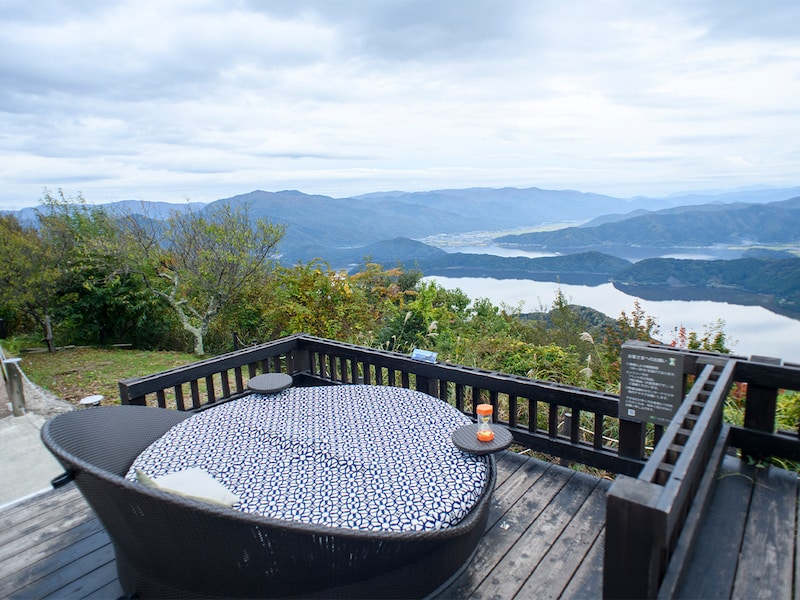 山頂まではリフトやケーブルカーでアクセス。足湯やカフェ、さまざまな趣のテラスなどの設備が充実していて、大パノラマとともに楽しめます。