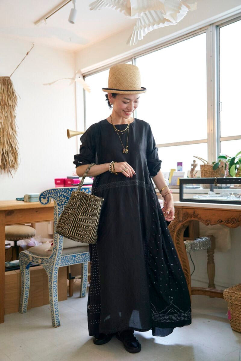 ワイドシルエットの絞り染めシルクワンピースをさらりと一枚で着こなす土村さん。「黒はジュエリーが一番映える色。インジリのワンピースは、伝統的な手仕事と洗練されたセンスが魅力です」と土村さん。バッグと靴も黒でまとめると、秋っぽさが際立ちます。