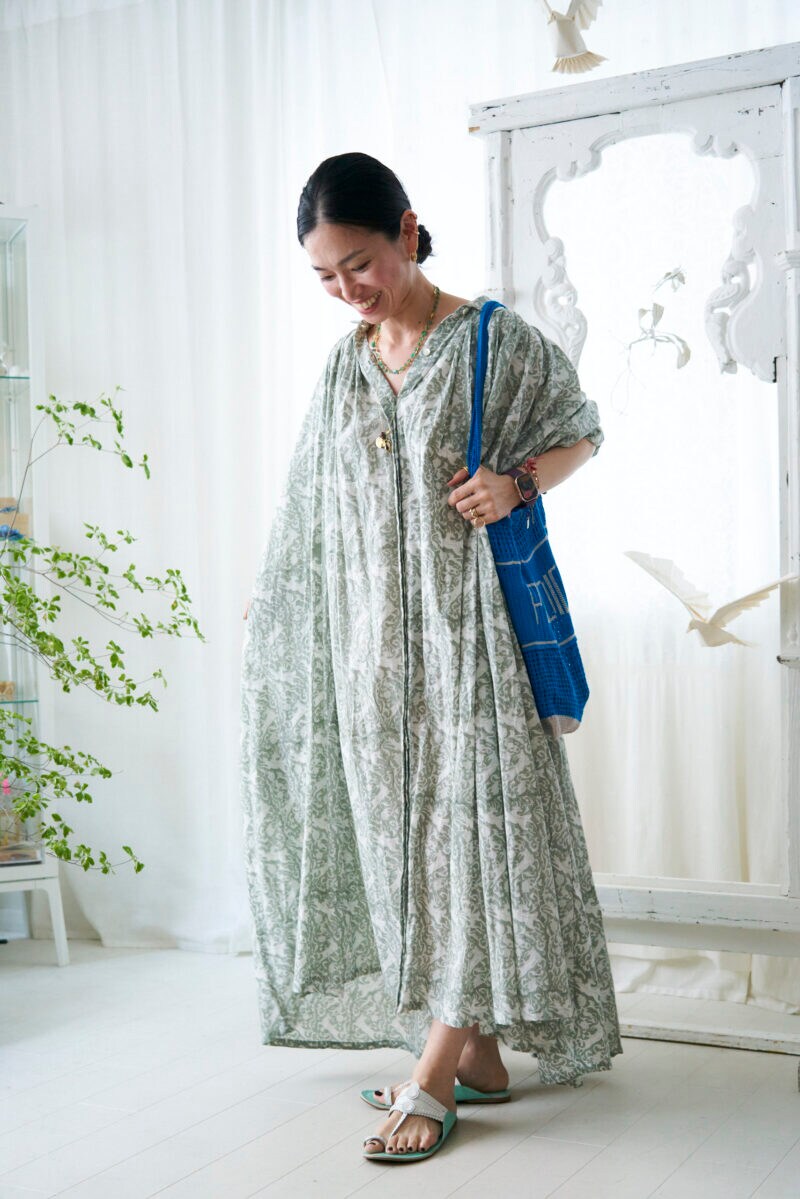 約三着分の布地を使った贅沢なワンピースは、今年らしいビッグシルエット。「トクリーのブロックプリントのワンピースは、風通しがよくて涼しいのに透け感はないんです。着こなしのコツは、えり首を着物のように少し抜くとかっこいいと思います」(土村さん)。セージグリーンの植物プリントが、ナチュラルで爽やかな印象です。