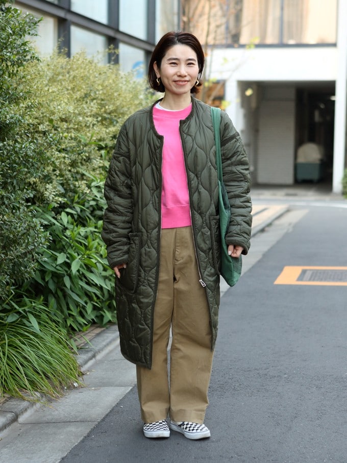 カーキのキルティングコートとベージュのパンツに合わせたのは、「フィーニー」のスウェット。シンプルながら上質感のある「シンゾーン」はアースカラーでまとめつつ、挿し色のピンクで軽快な街歩きスタイルに。顔まわりを明るく見せるアイテム選びが、若見えのポイント。