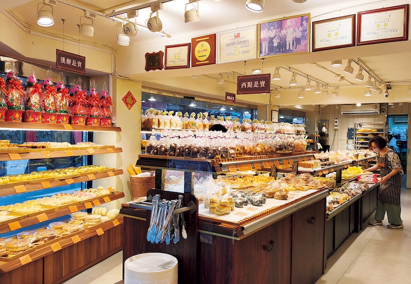 松江市場向かいに位置し、人々の生活に溶け込んでいる街角のベーカリー。15歳からパンや菓子づくりを学んだという創業者が1972年に店を構えた。現在は2代目が跡を継ぐ。棚には昔ながらのパンのほか、パイナップルケーキや月餅などの郷土菓子、さらにスポンジケーキやクッキーなどの洋菓子が並ぶ。長寿のお祝いの際に食べられる「寿桃(桃の形をした中華まん)」も看板商品だ。商品数は100種におよび、すべてが手づくり。レモンケーキは市場で購入した台湾産レモンの搾り汁を用いており、爽やかな風味が魅力。パリッとしたチョコの食感とふかふかのスポンジ生地が絶妙で、万人受けする味わい。また、バニラ味、チョコ味、イチゴ味のブッセも人気だ。いろいろと買いたくなるはず。