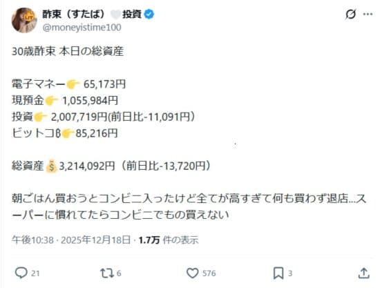 酢束さん:最初は全然「いいね」も付かず、ゼロでした。でも、日記というか、レコーディングダイエットみたいな感覚で、総資産を1円単位で計算して載せていました。