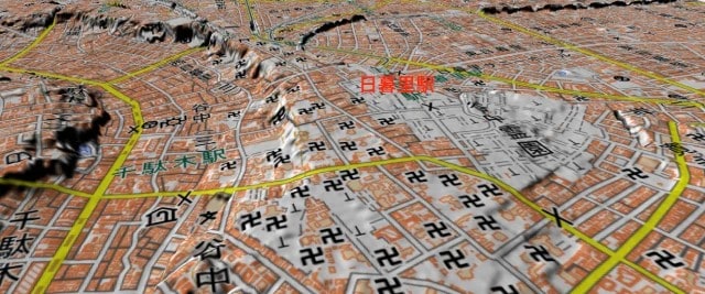 駅からは緩い上り坂だ。左手に墓地の駐輪場が見える。これを過ぎると、このあたりではたぶんもっとも標高が高い場所に登り着く。ここらは、関東平野に広がる武蔵野台地の東端にある上野台地の一部なのだそうだ。国土地理院の地図で確かめると標高は約20メートルだ。