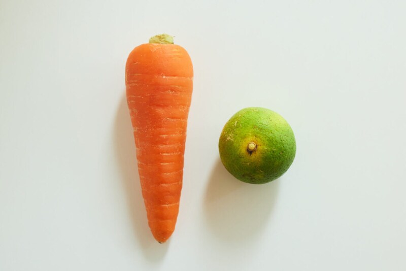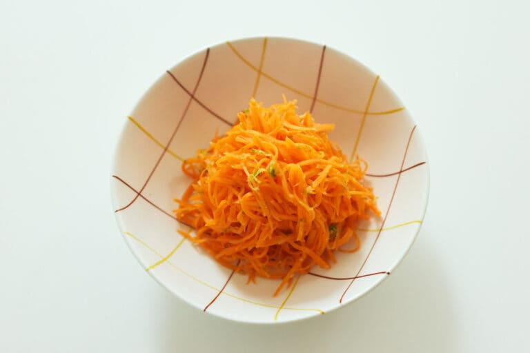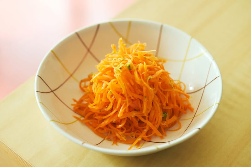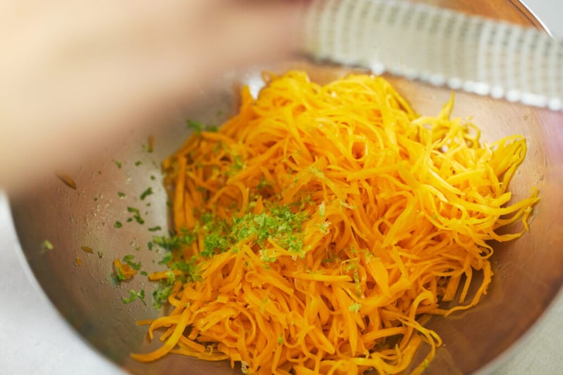 人参に、のゴマだれを大さじ1加える。柑橘の皮をゼスターでおろし、搾り汁を加えて完成。