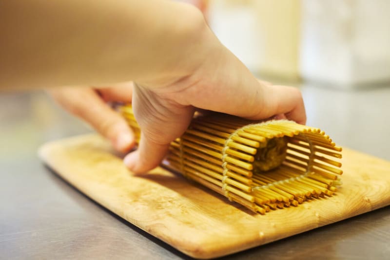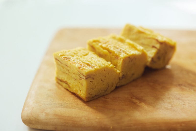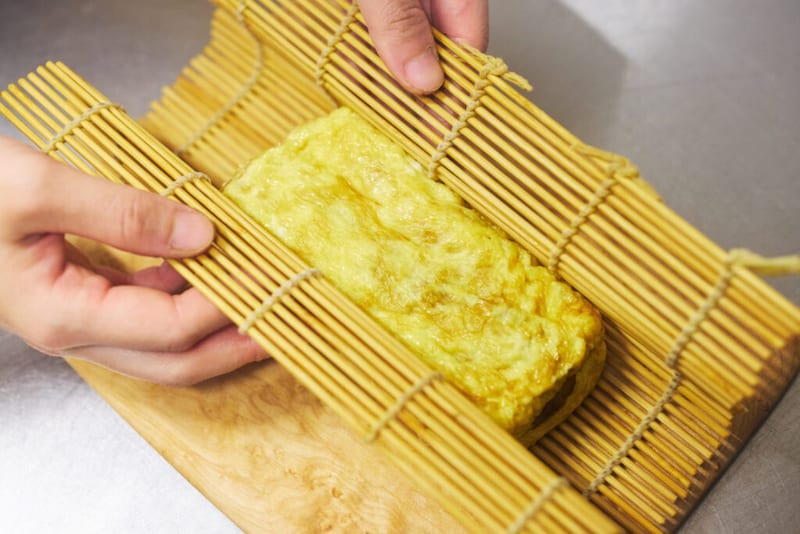 最後に甘めの卵焼き。卵をボウルに割り入れたら、鰹出汁、砂糖、薄口醤油、みりんを加えてよくかき混ぜます。卵焼き器を温め、サラダ油を引いて、5回くらいに分けて卵を流し入れます。ここまでは普通の焼き方ですが、焼き終わってからがポイント。巻きすに取り、温かいうちに形を整えます。