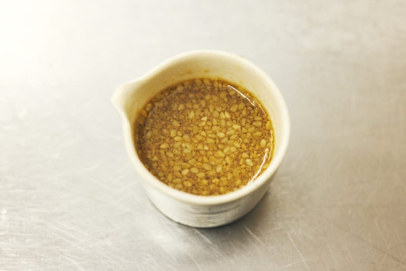 の材料を鍋に入れ、弱火で煮立てる。砂糖が溶けたら火を止め、すりごまを加える。