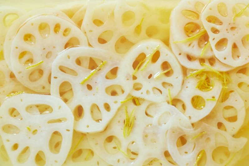 次に蓮根の調理を。薄切りにして、熱湯で1分半さっと茹でます。ザルにあげて、水が切れたらタッパーなどの保存容器に移しましょう。次にもう一つ鍋を用意して、酢、砂糖、塩、鷹の爪を入れて煮詰める。砂糖が溶けたら火を止め、熱々のまま蓮根にかけます。最後に柚子皮を千切りにし、果汁と一緒に加える! 以上、こちらもあっという間に完成。