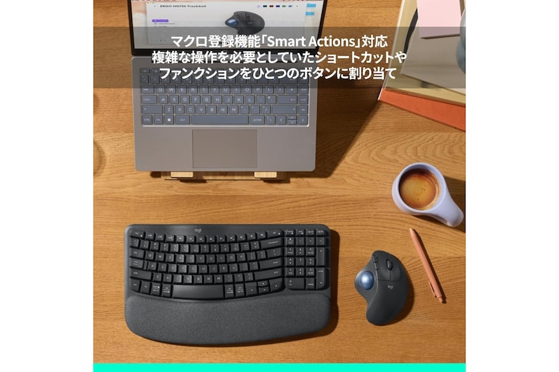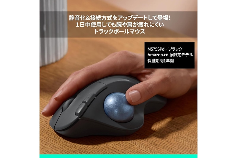 ロジクールのワイヤレストラックボールマウスM575SPは、手首を動かさずに親指でボールを転がして操作できるタイプなので、デスクが狭い環境や長時間作業でも姿勢を崩しにくいのが魅力です。