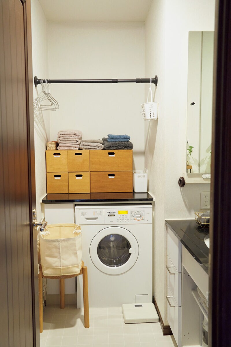 洗濯乾燥機の上の木箱は無印良品のもので、タオルや娘のパジャマなどを収納。