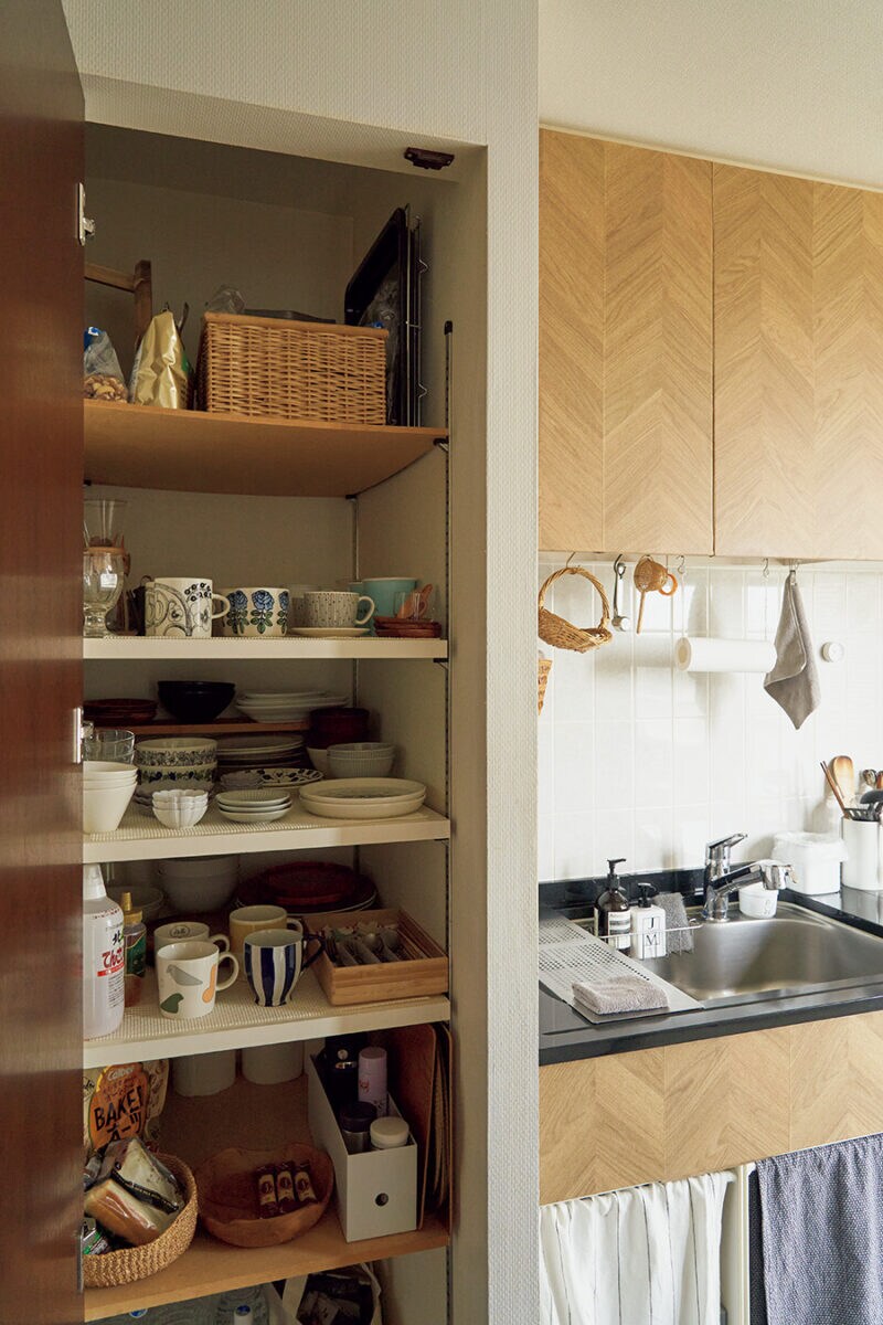 シンクの横に備え付けられていた収納庫の扉を外して食器棚に。