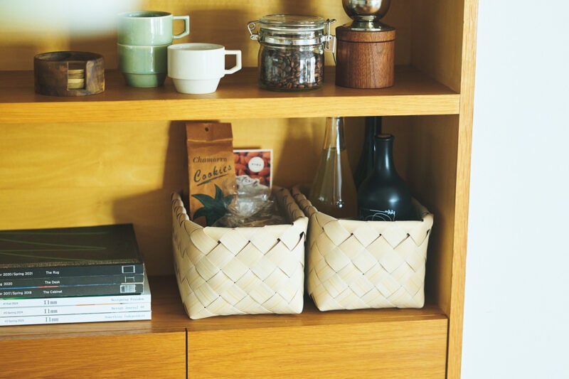 パッケージやサイズがさまざまな食品やボトル類は、大まかに分類してバスケットにまとめて収納。そのまま棚に並べるより出し入れしやすくなり、見た目の印象も整います。