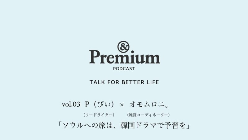 聴く『&Premium』の第3話は、2026年2月号「ひとりでも、韓国・ソウルへ」特集にちなんだトークをお届け。「家族で受け継ぐ、ソウルフルな名店」企画で数々の食の名店を取材したフードライターのP(ぴい)さんと、本誌連載「&TRIED IT」でおなじみの雑貨コーディネーター、オモムロニ。さんによる、ソウルの旅にまつわるスペシャルトークです。大の韓国ドラマ好きの二人に、ドラマで観たあの風景、あの食、あの雑貨について、語ってもらいました。「ソウルに行く前に、韓国ドラマを観ておくと、もっと楽しくなる」と熱弁する、二人のおすすめドラマとは?