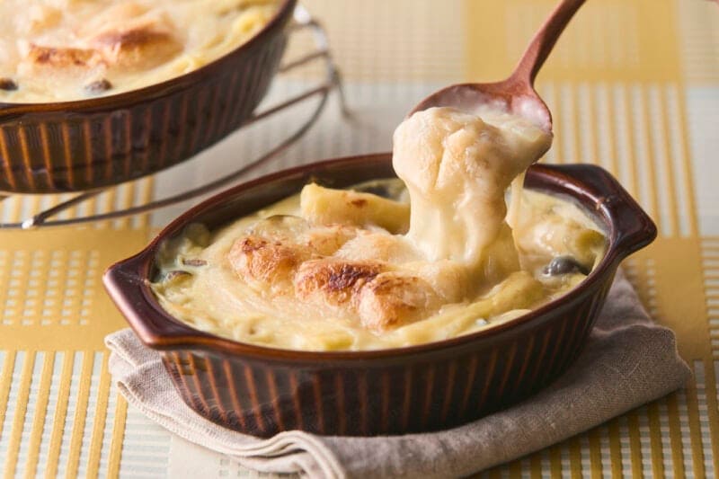 植物性チーズは動物性のチーズに比べて、「冷めても固くなりにくい」「再加熱で柔らかくなる」という特長があります。また、加熱調理すると溶け込んで食材と馴染みやすいので、スープやソースへの使用もオススメです。これらを活かしたおすすめレシピをご紹介!