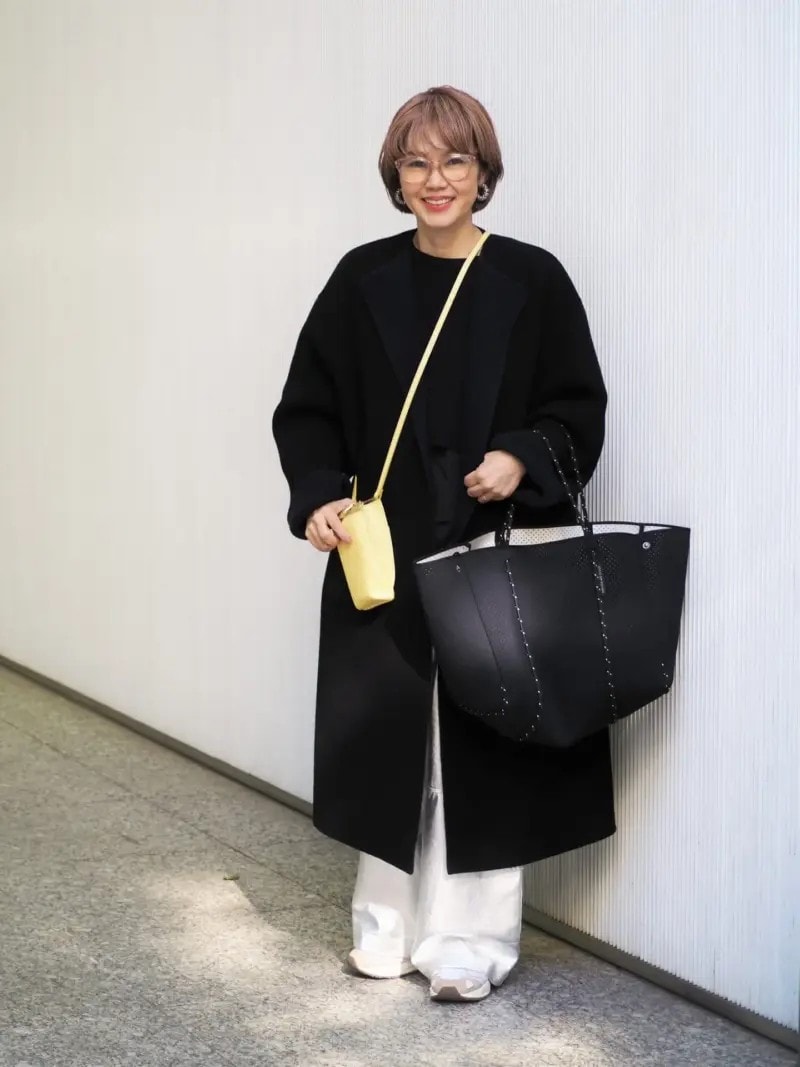 シャツ付きのニットに『オオシマレイ』のガウンコートをはおり、足元は動きやすさを意識してスニーカーをセレクト。ネイビーのコートに映えるイエローのスマホショルダーは、「ヴィオラドロ」で購入したもの。「大きいバッグとは別に、使う頻度の高い必需品を入れています」