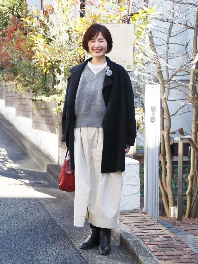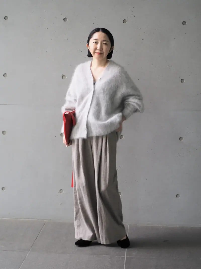 コーディネートの主役は、ふわっと空気をはらんだような質感のカシミヤカーディガン。「素材はカシミヤ100%で着心地も抜群。今季のマストバイアイテムです」。ボトムは落ち感のある太めのパンツをチョイス。柔らかなグレーのグラデーションにパッと目を引く赤いバッグを合わせ、鮮度の高い着こなしに。