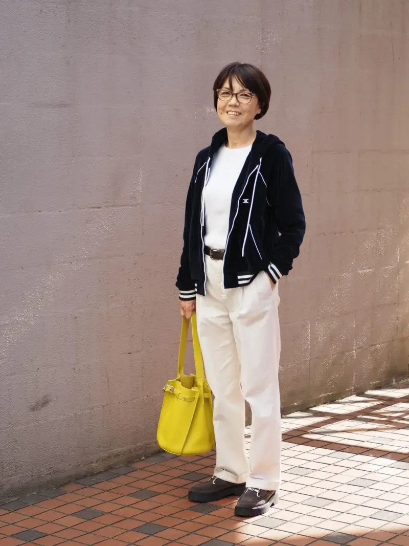 「セリーヌ」のベロアパーカーに、白いトップスとパンツを合わせて爽やかな冬のマリンスタイルが完成。「パーカーは昨年からずっと狙っていたシリーズのひとつです。肌に自然と吸い付くようなやさしい質感がすばらしく、毎日のように着ています」。ハンドルの長さをアレンジしたイエローのバッグがアクセントに。