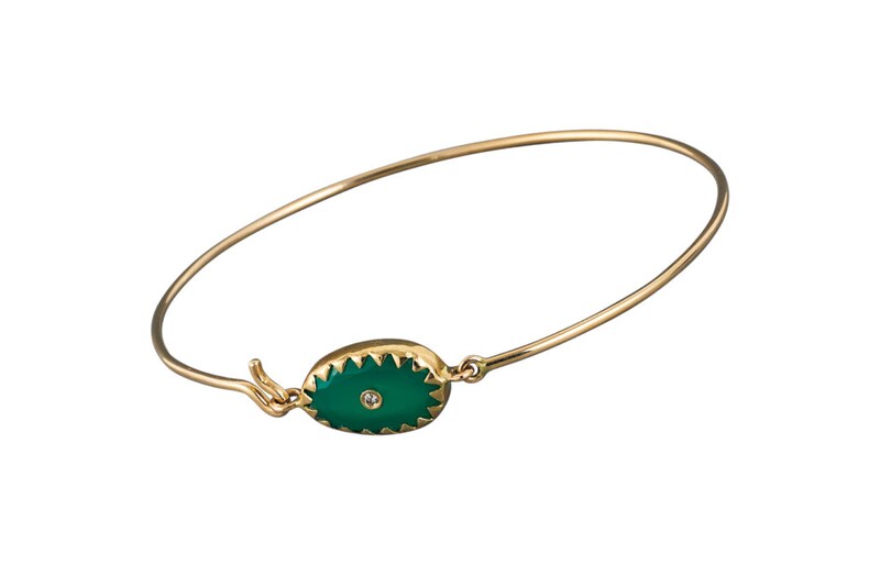 天然石の個性を引き出すことに定評がある、フランス発の〈パスカル・モンヴォワザン〉のアクセサリー。手仕事から生まれる温もりある表情や、ヴィンテージとボヘミアンが融合するユニークな存在感が際立つ。グリーンオニキスを主役に添えたバングルは、繊細なゴールドフレームとさりげなく中央にあしらわれたダイヤモンドが印象に残る。