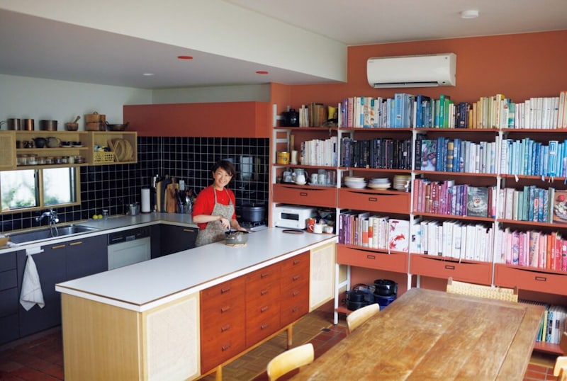 さらに、小堀さんは長年愛用してきた家具も、この家のキッチンになじむようにリメイク。増設したカウンターの下には、20年前から使っている北欧のヴィンテージチェストを設置し、両サイドにはラタン扉の収納を加えた。壁はお気に入りの床と揃えてテラコッタ色に塗り、その前には、料理にまつわる本を色別にグラデーションで並べた圧巻の本棚が。