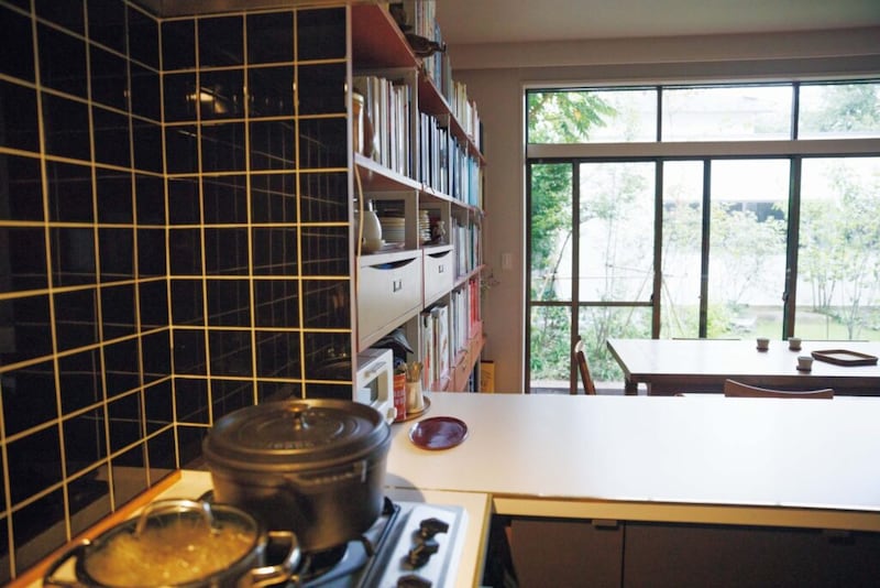 「もともとは台所と食事するスペースが壁で仕切られた、昔ながらの閉鎖的な間取り。その壁をなくし、レッスンで大人数分の料理もしやすいように奥行きのあるカウンターを造作し、ゆったりとしたコの字型のオープンキッチンにしました。調味料や道具類は、無駄な動きがないように準備や調理、盛り付けなど動線を考えて収納。また、以前からの黒タイルの壁や横長で広いシンクは、気に入っていたので生かすことに」