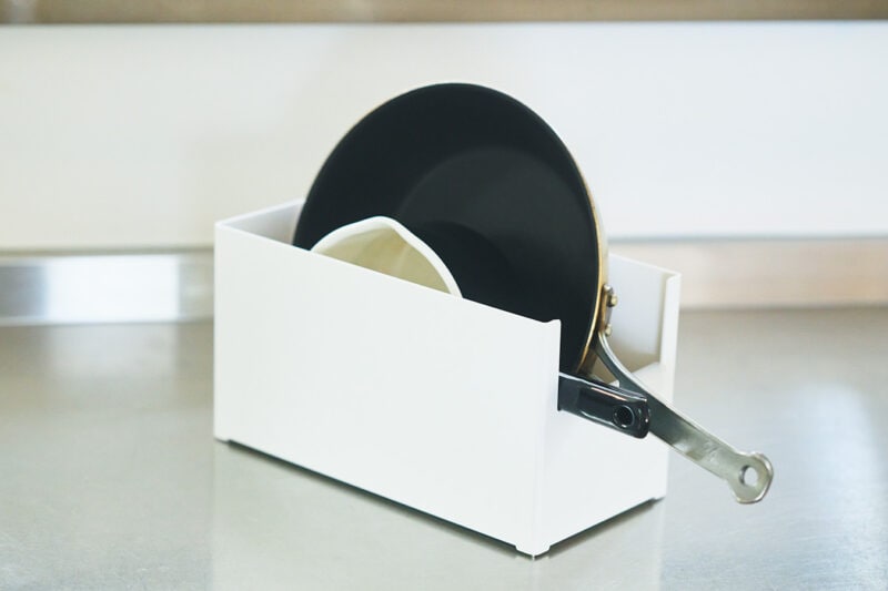 前方がコの字型に開いているので、フライパンの柄も引っかかることなく、片手で取り出せます。